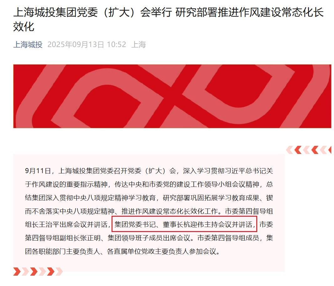 【大河财立方消息】9月13日消息配资炒股开户网,据上海城投微信公众号,9月11日,上海城投集团党委召开党委(扩大)会,集团党委书记、董事长杭迎伟主持会议并讲话。