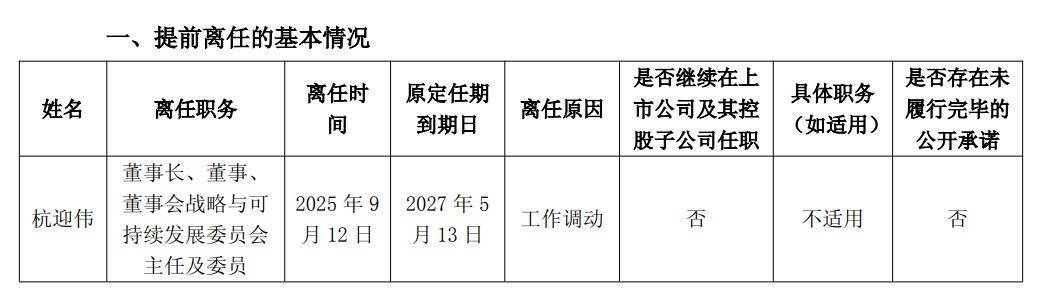 9月12日下午,上海建工集团股份有限公司发布公告称,董事会收到公司董事长杭迎伟的书面辞职报告。杭迎伟因工作调动,辞去公司董事长、董事、董事会战略与可持续发展委员会主任及委员职务。