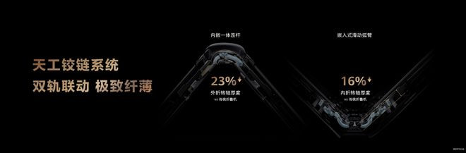 折叠屏的筋骨在于铰链,而三折叠的铰链更是难上加难。华为首创的天工铰链系统,本质上是一套为三折叠重新构建的结构系统。外折部分采用一体连杆的内嵌式设计,显著压缩铰链体积;内折部分引入首创的嵌入式滑轨结构,让三段屏幕的弧路更短、运动更统一。多驱精密调校的加入,则让三段柔性大屏在开合间保持几乎一致的阻尼与轨迹,使三折叠的形态切换真正做到自然、顺滑。